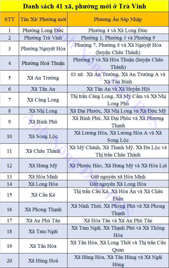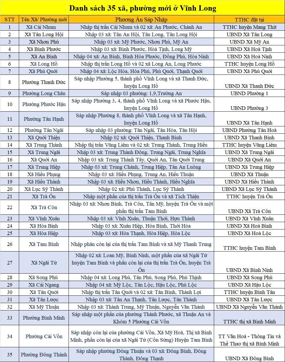 Ủy ban Thường vụ Quốc hội đã chính thức ban hành Nghị quyết số 1687/NQ-UBTVQH15, thông qua phương án sắp xếp các đơn vị hành chính cấp xã trên địa bàn tỉnh Vĩnh Long. Theo đó, kể từ ngày 1/7/2025, Vĩnh Long sẽ có tổng cộng 124 đơn vị hành chính cấp xã, bao gồm 105 xã và 19 phường.